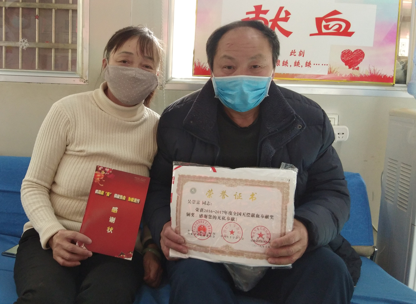 吴崇富先生拿到全国无偿献血奉献奖荣誉证书时说“我年龄超过60了,不能再献了,今天带我夫人来献血,请她接力。”