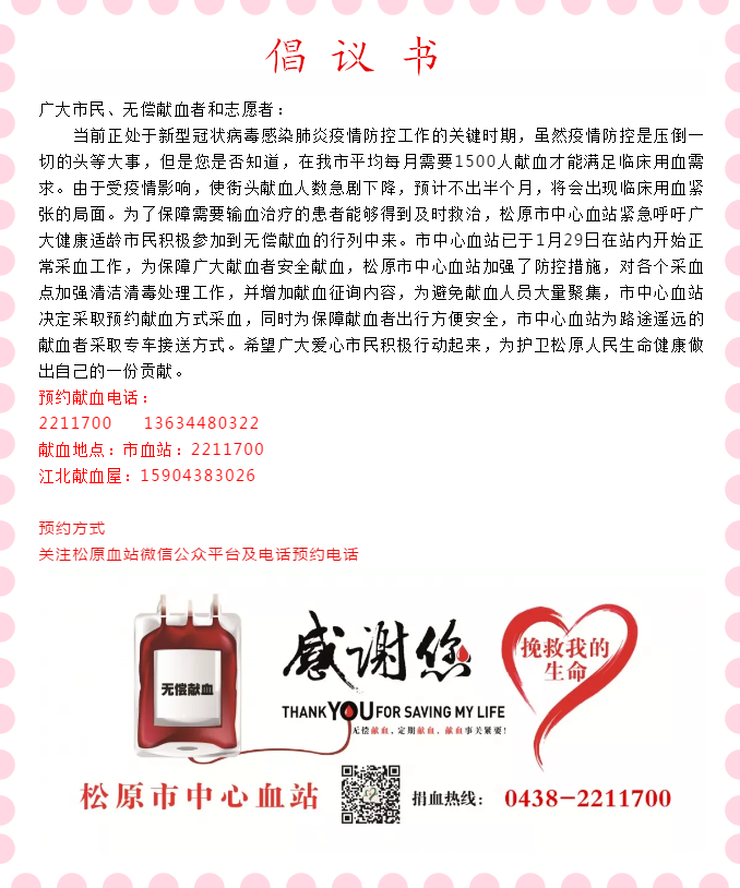 疫情期间,由于各小区,乡镇村屯实行进出行管控,导致人员外出减少,可献血人员外出困难,导致采供血工作陷入困境,虽然市中心血站采取了电话预约献血等多种措施,但采血量还是不能满足临床用血量。为了缓解松原市各医疗机构临床供血紧张局面,市中心血站发出了无偿献血倡议书。