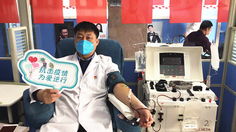 今天参加献血的人还有市血站办公室副主任辛志永,他常年坚持无偿献血,只要患者有需要,符合条件他就献,截止目前他已献血44次献血量11400ml。在疫情期间,作为血站人他深知血源的紧张,采血的困境,因临床需要他捐献了一个治疗量的血小板。捐献成功后的他依然坚守在自己的工作岗位。从1月26日至今他一天都没有休息,坚守在防控一线,今天他又以献血的方式投身到这场抗击疫情的战斗,用热血来帮助他人,为打赢疫情防控阻击战贡献自己的一份力量。