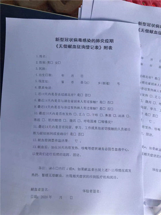 疫情期间,除日常的献血前健康征询外,您还需配合体检医生进行体温测量,并如实告知个人近期旅居史及个人身体健康情况,填写《新型冠状病毒感染的肺炎疫期<无偿献血征询登记表>附表》。