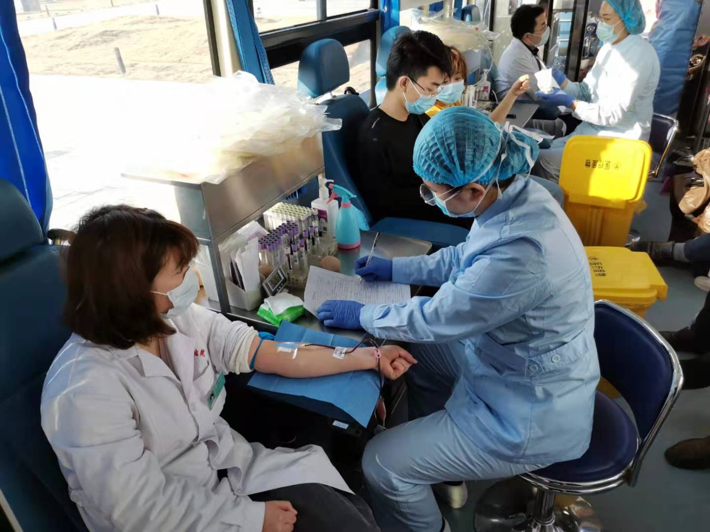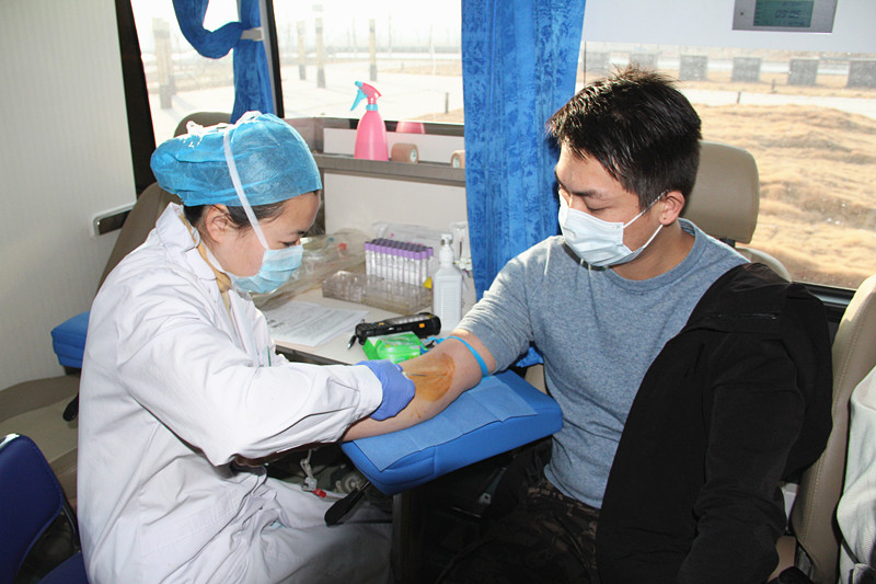 献血现场氛围热烈,献血志愿者热情高涨,他们第一时间填写了无偿献血登记表格,测量血压、量体温、检测,经过初步体检合格者,拂袖献血。在新型冠状病毒感染的肺炎疫情下,为了保证献血者的安全,他们四人一组,献血车也全部按照国家规范严格消毒,并时时动态消毒,避免造成病毒和疾病传播。