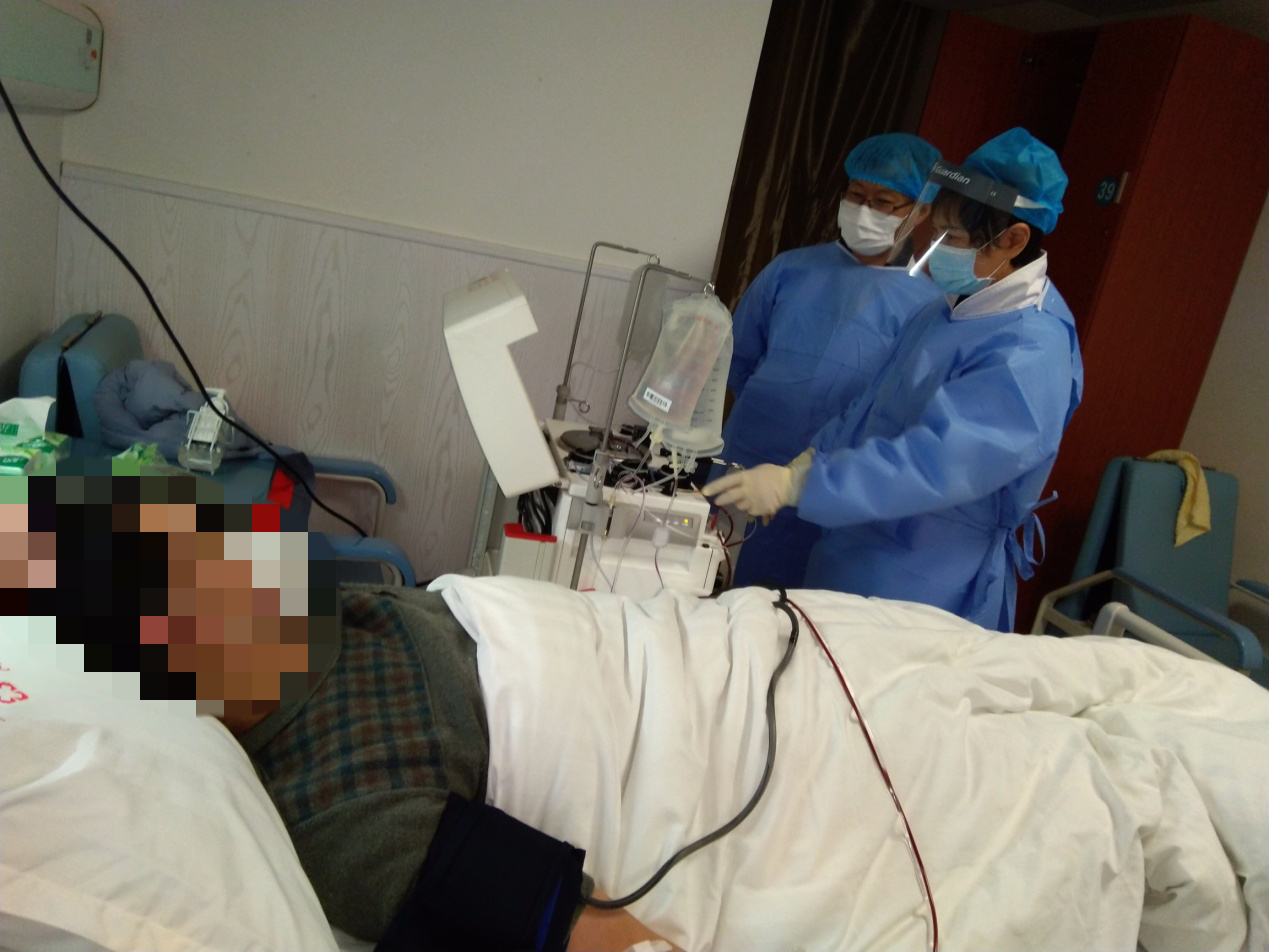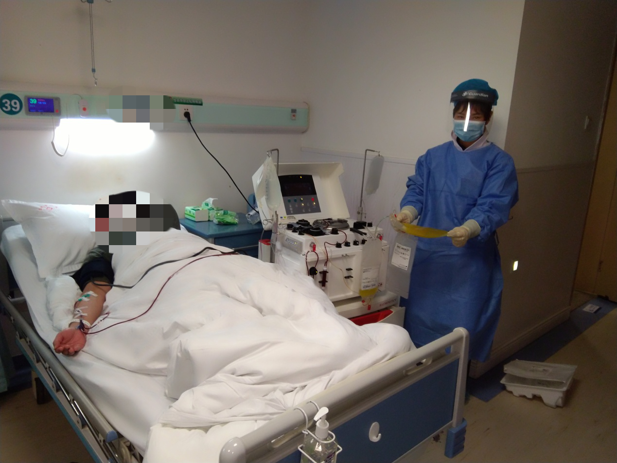 11点35分到达医院时,第一人民医院血库主任何啸将大家带至留观病房外,穿上隔离衣,到病房将采集设备准备好,进行采集前的严格消毒。随后,血站工作人员为治愈者进行了血浆采集。采集过程中通过不断交谈,缓解治愈者的心理压力。经过1个多小时,顺利完成了400毫升的血浆采集,医院工作人员立即将血浆用于患者治疗。回到血站后工作人员再次对成分分离机进行消毒擦拭,待回家已是凌晨3点。