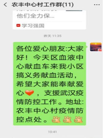 在此次疫情特殊时期,望洪镇农丰中心村防疫卡点临时党支部在镇党委的指导安排下,加班加点落实国家疫情防控措施,以党员为先锋走村入户劝导宣传,对外来人员登记走访,24小时进行疫情监控,采取疏堵结合的方式确保村民安全。望洪镇农丰中心村党支部书记郑海提到:“疫情期间,我们全力以赴按照国家、自治区、银川市的要求认真做好疫情防控工作。对无偿献血公益事业无条件给予支持。望洪镇开展无偿献血工作已经6年,献血参与人数有增无减,我们还会为献血者提供车辆接送服务,为献血者提供午餐,在村部开设献血宣传栏,在疫情防控期间,为献血车开辟绿色通道,会一如既往地支持无偿献血工作,也会在未来积极做好无偿献血宣传,让献血小分队不断壮大,让更多的人参与到无偿献血队伍中,让更多的病患者受益。”