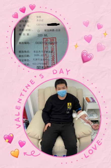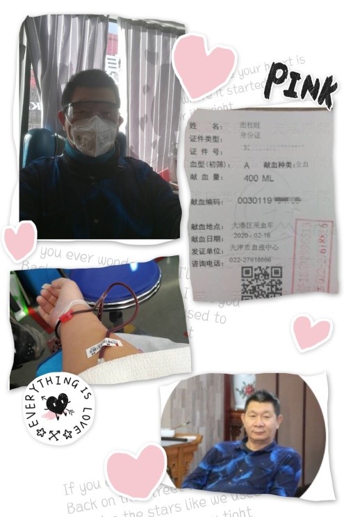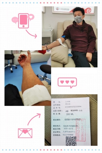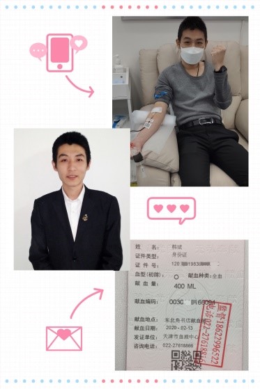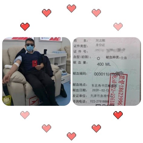 第一个响应的人当然是董雪峰董事长本人,他说,和天津市无偿献血形象大使孙阳了解情况后得知,目前天津市血液短缺的现状,觉得这事儿他应该去做。在群里发完倡议后,他就走出家门去献血了。那天是2月14日,当时下着大雪,可是让他感到遗憾的是,风雪没能阻挡他的热情,却因为转氨酶偏高,未能成功献血。董雪峰说没能献成血,感到特别遗憾,有机会还会继续献血的。