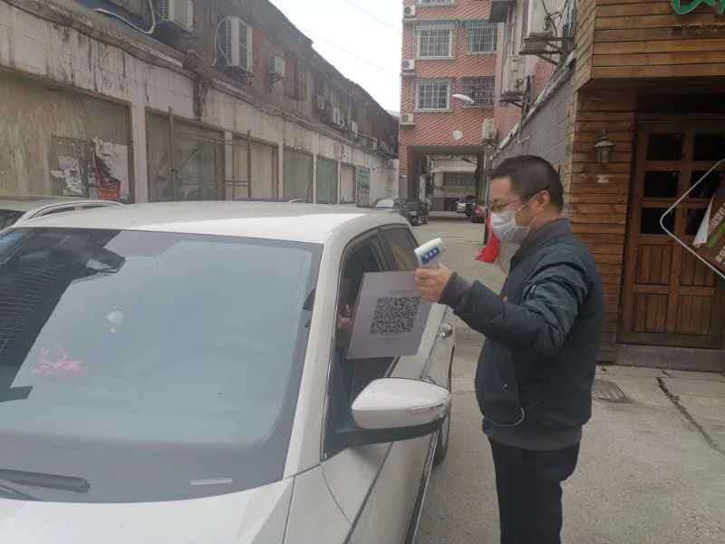 王大为在执勤点防控值守,为居民测量体温