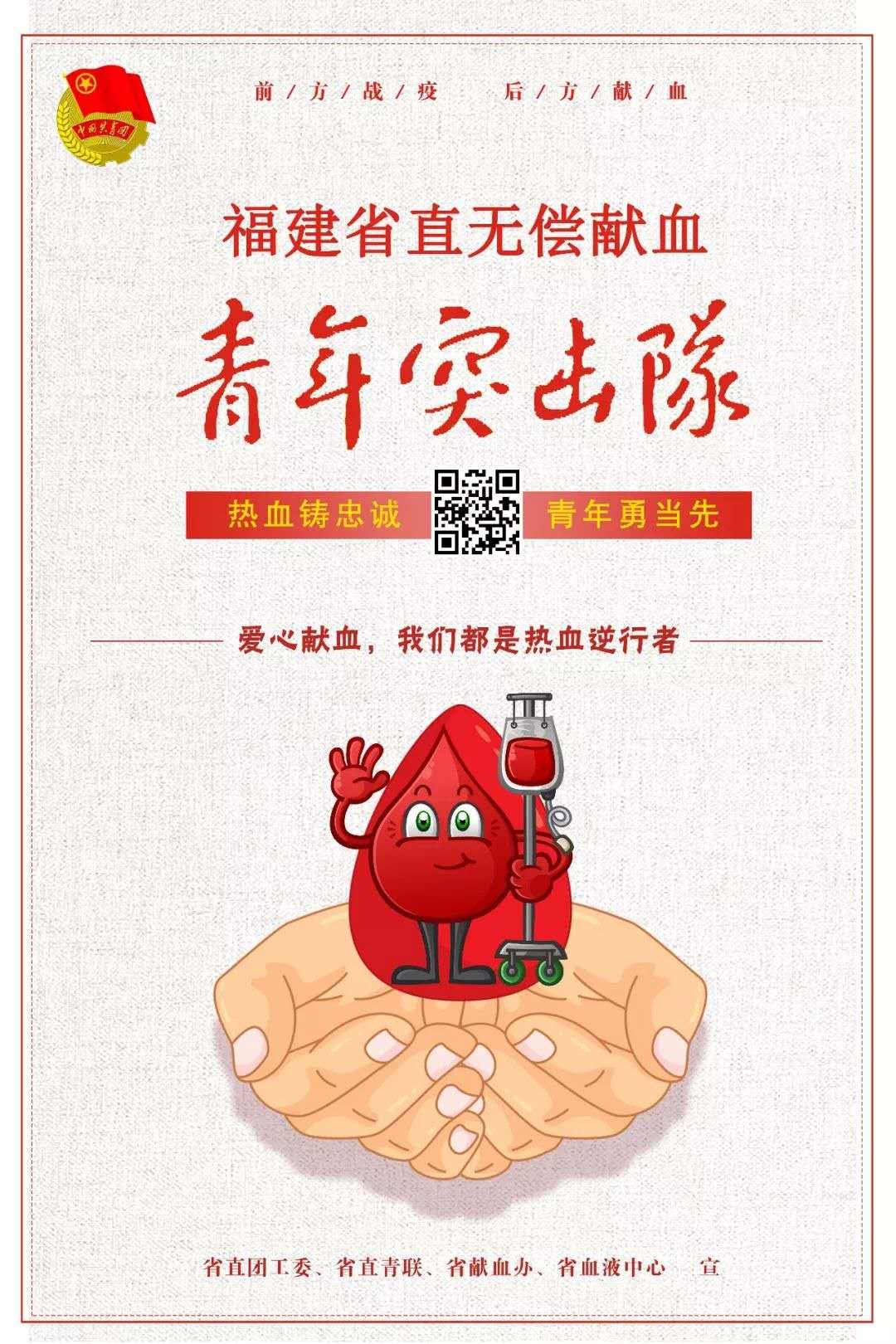 “热血铸忠诚 青年勇当先”,于2月17日省直团工委、省直青联、省献血办、省血液中心正式发布省直无偿献血青年突击队招募令,仅一天时间,就有近千名青年报名。福建省人大环城工委工作人员郑高迪是首个参与活动的青年,他听说省直团工委正组建无偿献血青年突击队的消息,不等“招募令”正式发布,即先行献血300毫升。