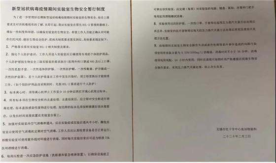 自新型冠状病毒疫情发生以来,全社会对该病毒的传播、防护、控制、隔离及治疗等方面高度关注,各级政府、单位、社区和医疗机构等也都第一时间制定相应的防控举措以保证疫情能得到最快最有效的控制。根据《关于新型管状病毒实验室生物安全指南(第二版)》及《关于新型冠状病毒疫情防控期间采供血工作的若干工作建议(第一版)》相关文件的解读:新型管状病毒主要的传播途径是经呼吸道飞沫和接触传播,气溶胶和消化道等传染途径尚待明确。无锡市中心血站检验科在疫情期间紧急制定了《新型管状病毒疫情期间实验室生物安全暂行制度》,在现行实验室BSL-2管理基础上增加了生物安全三级防护措施,以进一步筑牢实验室生物安全防线。