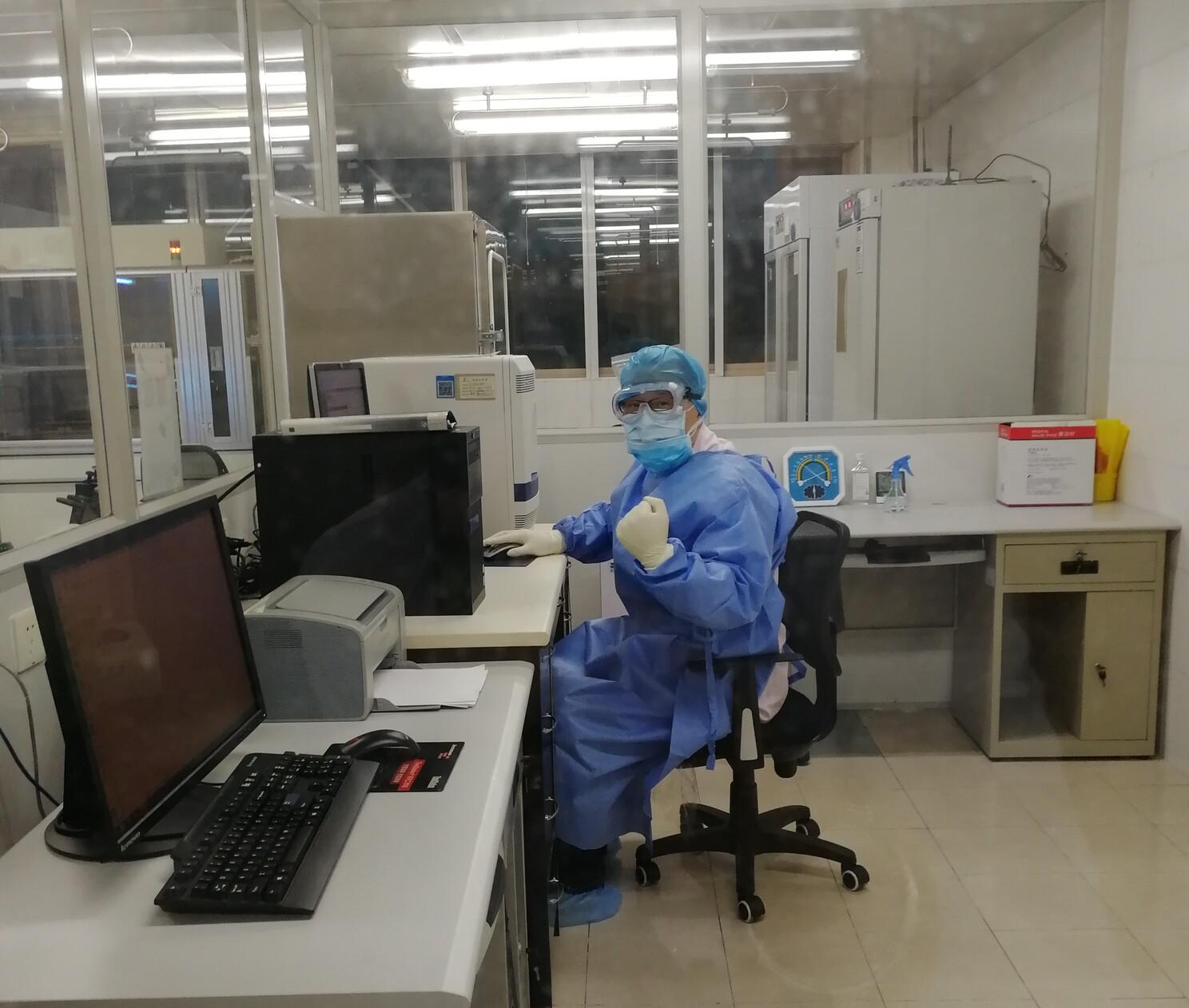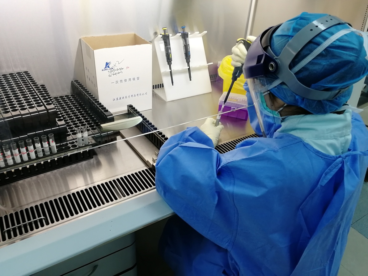 检验科副主任金一鸣、年轻党员何红红闻讯,立刻从家中赶来实验室,换好工作服,做好个人防护,迅速投入到核酸检测中。