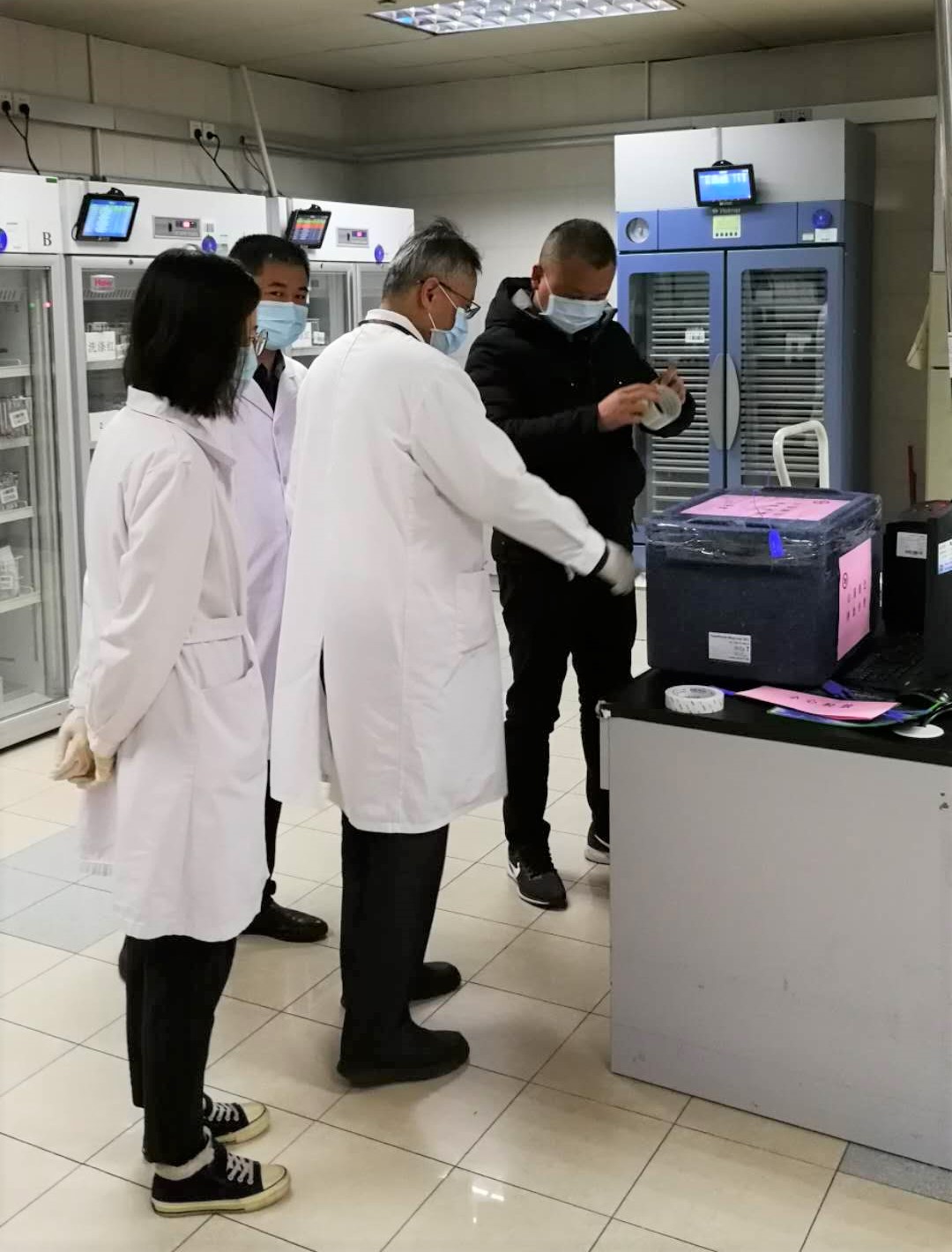 采集好的新冠肺炎康复者血浆抵达市中心血站,核查交接,信息入库,置速冻冰箱待检。