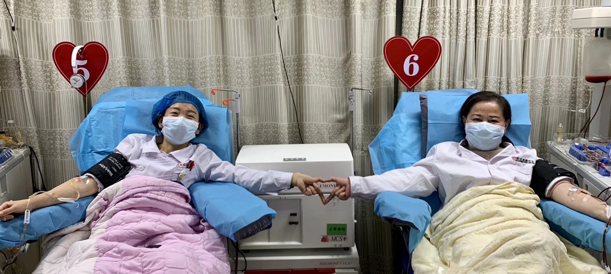武汉血液中心成分献血科主任陈涵薇和副主任谢松丽在献血