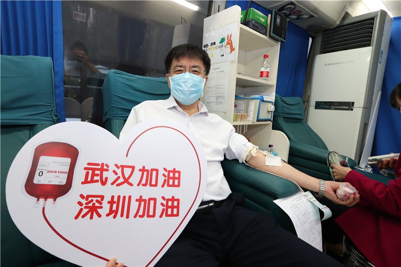 说到党员带头,党委书记张天奉率先垂范。张书记踏上捐血车,看到车上的同事们,第一句话说的是“都是家人啊!”。在抗疫的特殊时期,奉献出自己的一份爱,就是在为深圳,为武汉加油!