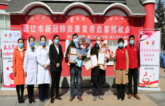 通辽市卫健委、通辽市红十字会和通辽市中心血站领导到现场看望慰问了两位捐献血浆者,为他们献花并颁发了国家卫生健康委员会、中国红十字会总会、中央军委后勤保障部卫生局授予的荣誉证书及中国红十字基金会的致敬状和慰问品、内蒙古自治区红十字会的感谢状和慰问金。两位刘先生现场将共计6000元慰问金和价值6000元的慰问品全部捐献给了通辽市新型冠状病毒感染肺炎防控工作指挥部。
