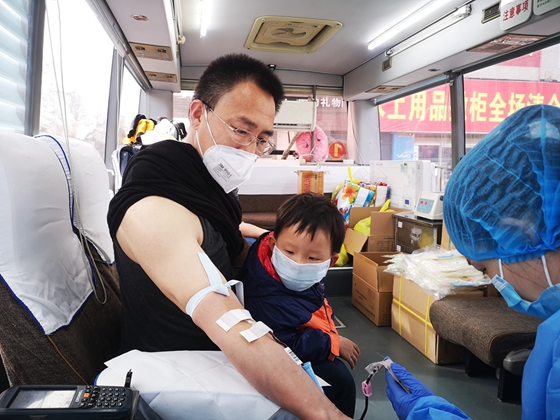 爸爸告诉孩子,长大了也要勇敢的献血救人(于瑞杰 摄影)