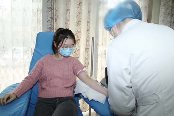正在应急献血的庞昕然(于瑞杰 摄影)