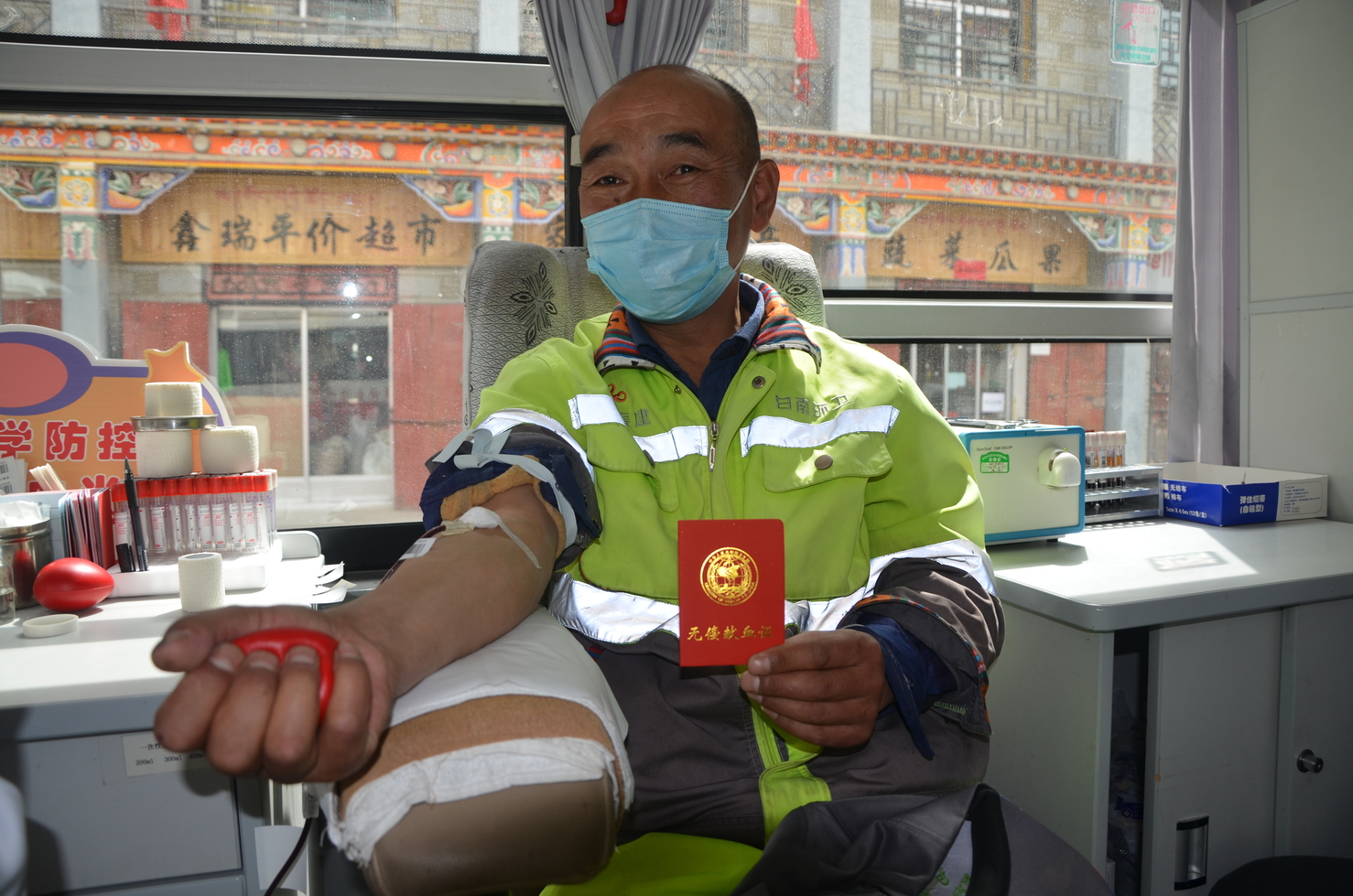 活动现场我们还看到了特别感人的一幕,很多环卫工自发加入到献血队伍中,他们虽然没有接受过高等教育,有的甚至不会写自己的名字,但是他们却有着一颗无私奉献高尚的心。当笔者问一位环卫工时,她说:“我没有啥文化,但是身体健康可以献血,能帮助那些病人,我很高兴”。简短的话语,朴实的行动,他们平日里无论严寒酷暑都始终坚持为我们的城市带来整洁,也许他们的双手沾有污迹,也许他们的身躯挂满尘土,但为拯救生命,他们毅然伸出手臂!他们就是最美献血者,我们由衷地向这些充满博爱、奉献精神的环卫工人致敬!向“疫”情期间每一位无偿献血者表示衷心的感谢!