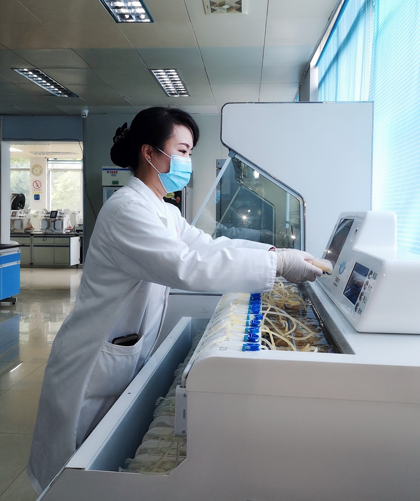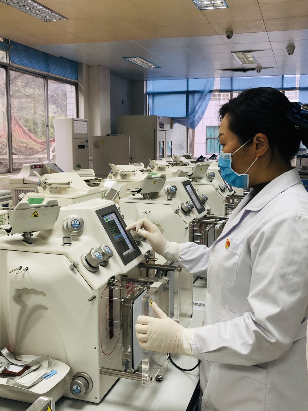 疫情就是命令,防控就是责任。放弃假期,单位一声召唤,立刻和家里的亲人和孩子说再见,戴上口罩奔赴工作岗位。为保证疫情防控期间临床用血需求,每天冷沉淀的制备量由原来的90U骤升至135U。姑娘们每天都需要提前到岗进行设备的开机启动、预温,为保证血液制备的全过程符合质量安全,精心做好各项准备工作,滤白、热合、装杯、配平、成分分离、病毒灭活……每一项工作都在有条不紊地进行着,每一个步骤的工作开展都需要姑娘们打起十二分的精神,认真核查,防止出错。即使夜幕降临了,成分制备间里仍能看见耀目的灯光及她们忙碌的身影。