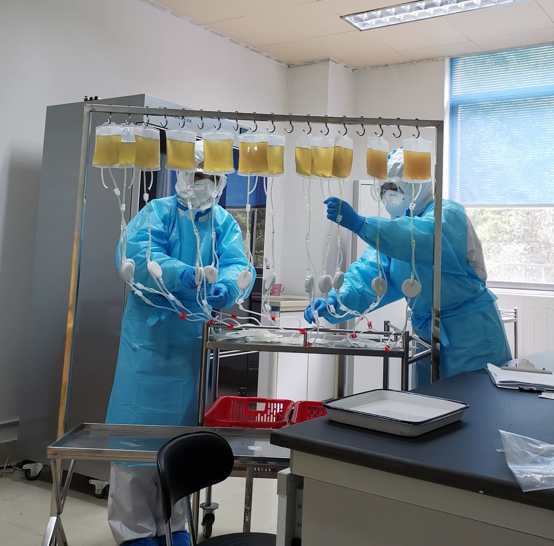 目前,新冠肺炎康复者恢复期血浆可以用于治疗新冠肺炎重症、危重症患者,省血液中心承担着全省新冠肺炎康复者恢复期血浆的检验、采集、制备等相关工作,已先后于2月24日、28日、3月3日、9日、13日、17日、4月3日,在省血液中心、省职工医院、省将军山医院新冠血浆采集点,采集和参与指导采集18人共计6600毫升血浆,每次采集任务完成后,成分制备科的工作人员都会在第一时间对血浆进行接驳分装、病毒灭活等工作,以保证经过灭活 处理的血浆可以尽早发往临床,用于救治新冠肺炎重症、危重症患者。