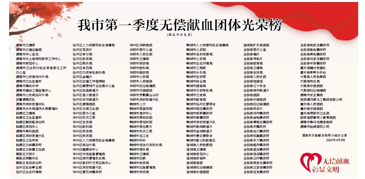 渭南市无偿献血工作领导小组办公室、渭南市中心血站谨代表广大用血病患,衷心感谢每一位“为爱逆行”的无偿献血者!