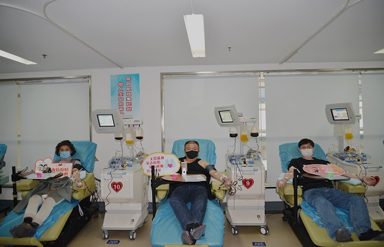 他们三位都是坚持献血一二十年的“老”献血者了,每次卫生健康系统万人流动血库启动之时,他们都会主动登上爱心献血车撸袖献血。由于近期临床用血量大幅增长,血小板用量也比较大,从未献过血小板的王英英主任决定来青岛市中心血站捐献单采血小板,大夫邹强和李传峰得知后也决定一同前来。三人都是初次捐献血小板,当天成功捐献5个治疗量单采血小板。