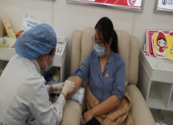 参加无偿献血的党员中,有的是连续多年献血的“老队员”,成本管理部胡萍,此前已在天津、南京等地多次奉献过自己的热血;也有第一次献血的“新人”,财务管理部邓硕,第一次献血却丝毫不惧,面带微笑。