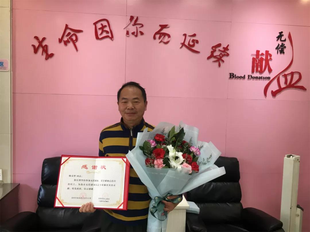 洛阳市第117位百次无偿献血者杨文博:第1次献血时间2003年8月1日,第100次献血时间2020年2月3日。期间共捐献全血25次10000毫升,机采成分血78次147治疗量,先后两次荣获全国无偿献血奉献奖金奖(2014年、2018年)。
