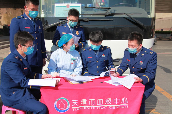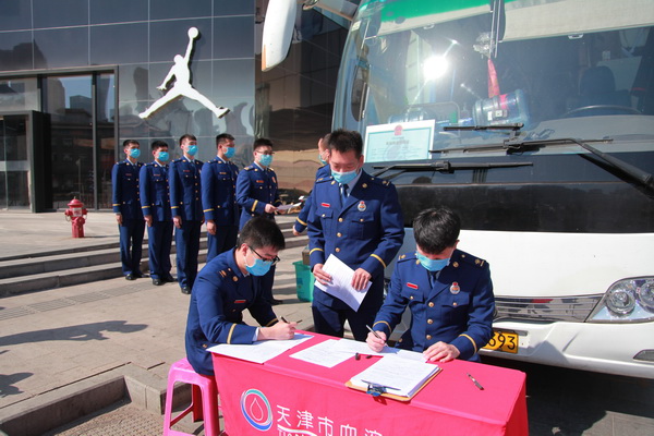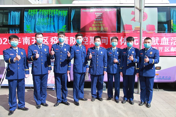 热血战“疫”,敬佑生命。近日,“热血火焰蓝 齐心共抗疫”活动在南开大悦城附近的一辆采血车上正式启动。来自市消防救援总队的消防指战员和消防文员陆续走上采血车,以无偿献血的方式为战“疫”加油。 “我第一个上!”32岁的郑旭尧撸起袖子,第一个走上了采血车。按照疫情防控要求,献血需错峰错时进行,每半小时一组,一组3个人。填写表格、测量血压、血样检测、组织献血,整个流程严格按照疫情防控期间的规定,有条不紊地进行着……这次是郑旭尧第4次献血,前3次都是在大学校园里。“疫病无情人有情,哪里有需要哪里就有我。”郑旭尧觉得献血是公民应尽的责任,自己得担起来。