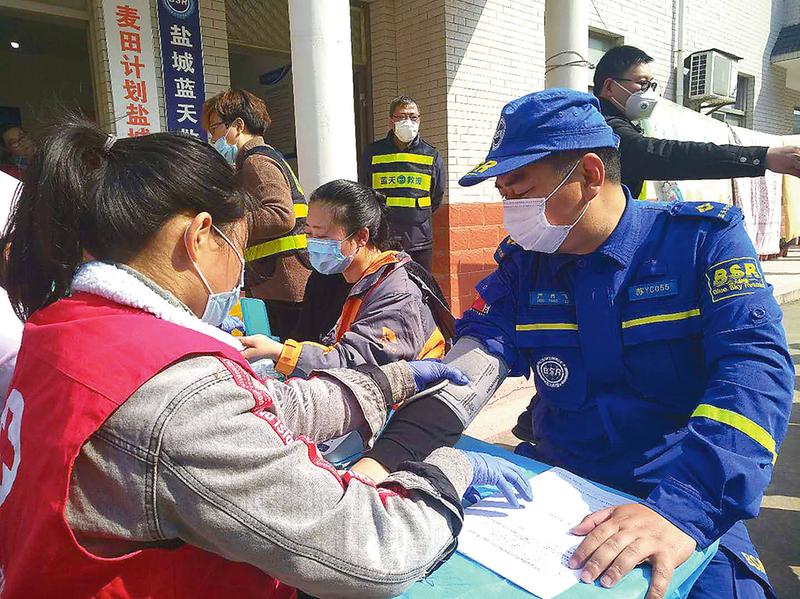 4月19日上午,盐城蓝天救援队联手麦田计划盐城分社,邀请盐城市中心血站的采血车开进队部,组团撸袖捐献热血。