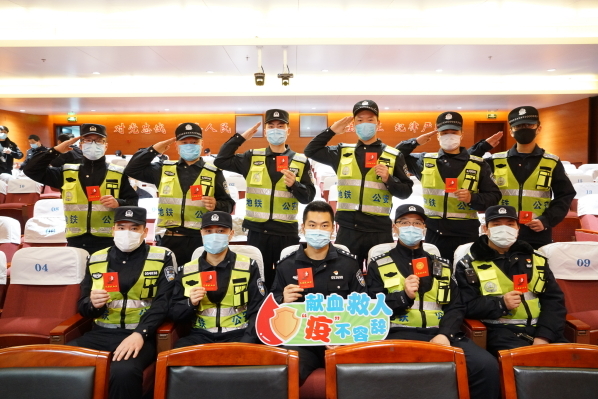 市公安局交通治安分局地铁北站派出所副所长韩超带着10名警务人员赶来献血,他们身着荧光色警服,井然有序地献血,成为现场一道亮丽的风景线。