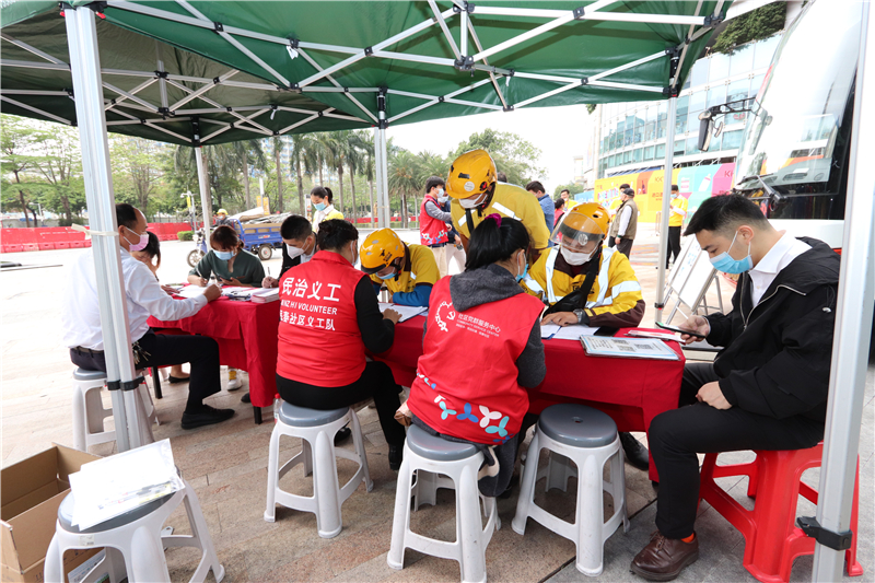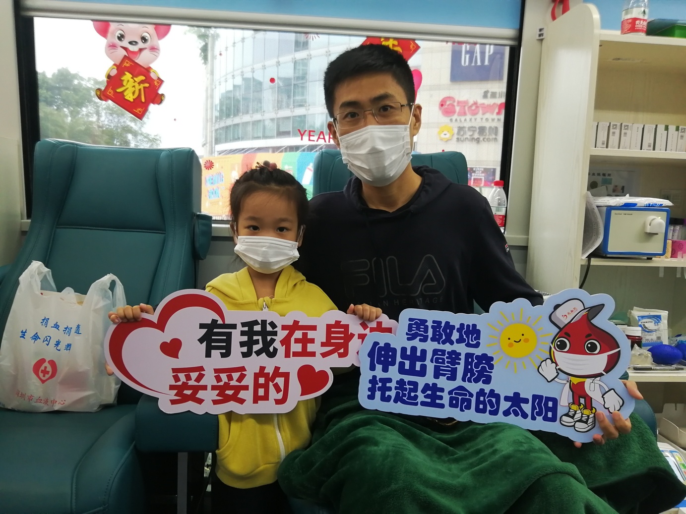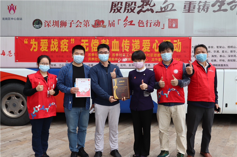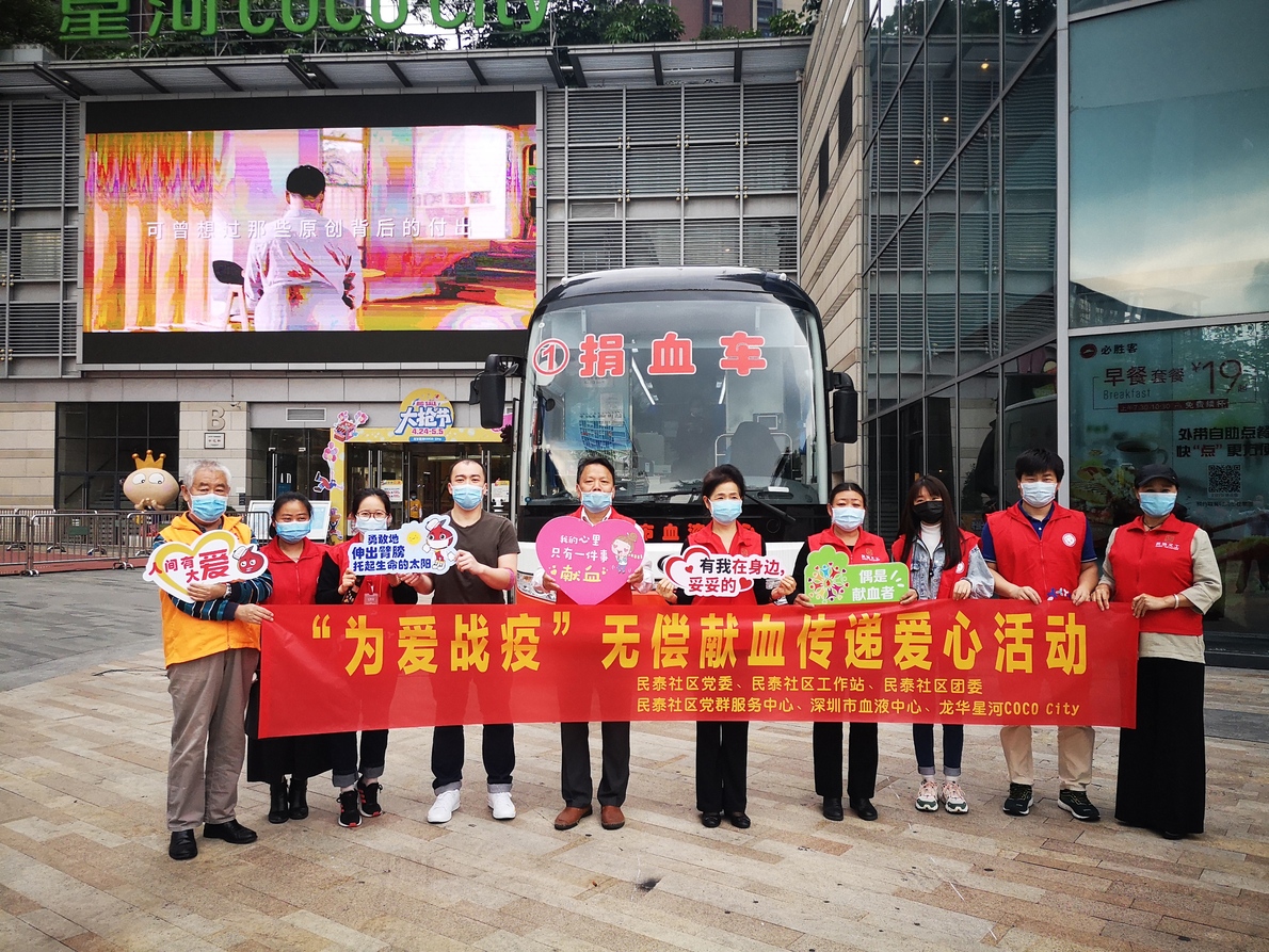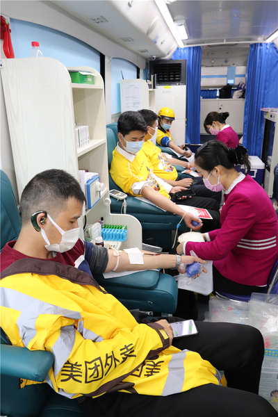 李拥拥、王恒、田斌、任智伟几位龙华星河COCO City的物业人员们穿着统一的T恤化身为一个个大黄人前来参加活动,满满的朝气!这边“大黄人”正在献血,那边又来了一拨美团外卖的“小黄人”,一时间捐血车上满眼都是亮眼的颜色,甚是和谐。
