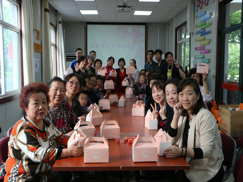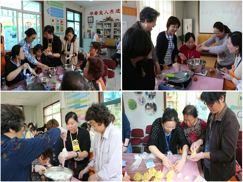 上海市血液中心的员工们与孤老妈妈们一起动手制作甜品