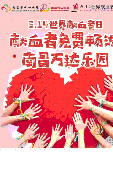 为庆祝第15个世界献血者日的到来,南昌市中心血站联合南昌万达主题乐园开展献血者免费游园活动。凡在2017年至今献血2次及以上的南昌地区献血者,即可在6月10至14日期间免票入园,一键畅玩万达乐园。此活动刚上线便引来众多献血者的关注,他们表示,献出爱心,挽救生命的同时,也能得到社会各界的关注以及回馈,内心十分开心,也一定会将无偿献血这份爱心继续传递下去。我站也将持续关注该活动。(南昌市中心血站 周慧琴)
