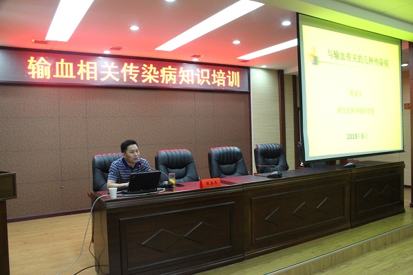 此次培训由湖北民族学院附属民大医院病理科副主任、病理学教授、硕士生导师陈显兵授课,陈老师分别从乙型肝炎的病症及传播、梅毒的传播历史和预防、艾滋病的病原学及传染途径等三个方面进行了深入浅出的讲解。他在授课中还着重强调了无偿献血工作在这三种疾病传播、治疗和预防中的积极作用。