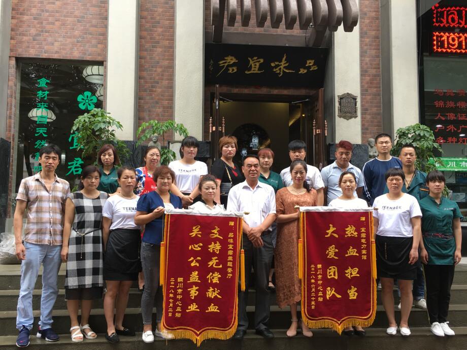 7月2日上午,铜川市中心血站副站长王义楼来到新区“品味宜君主题餐厅”,向总经理李风玲送上了绣有“支持无偿献血 关心公益事业”、“热血担当 大爱团队”两面锦旗,感谢宜君电力商贸有限责任公司以及“品味宜君主题餐厅”的全体员工对我市无偿献血工作的支持。