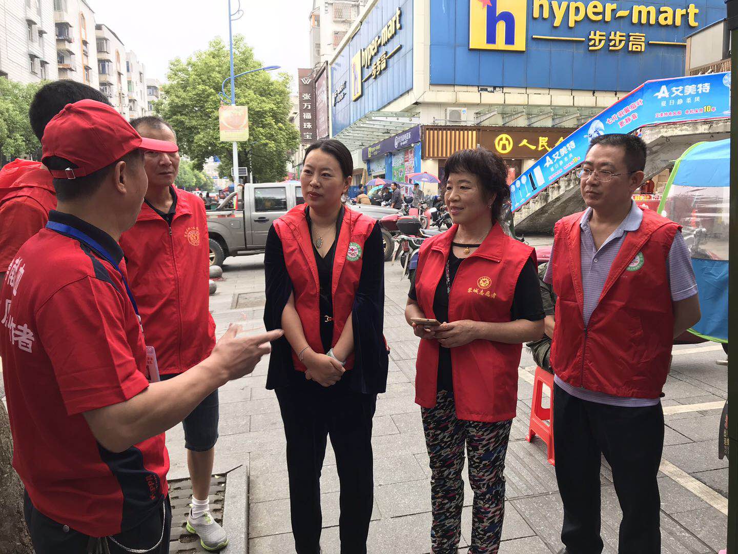 无偿献血者服务队成员向桂阳县副县长周晖(左四)介绍无偿献血志愿者日常工作情况。