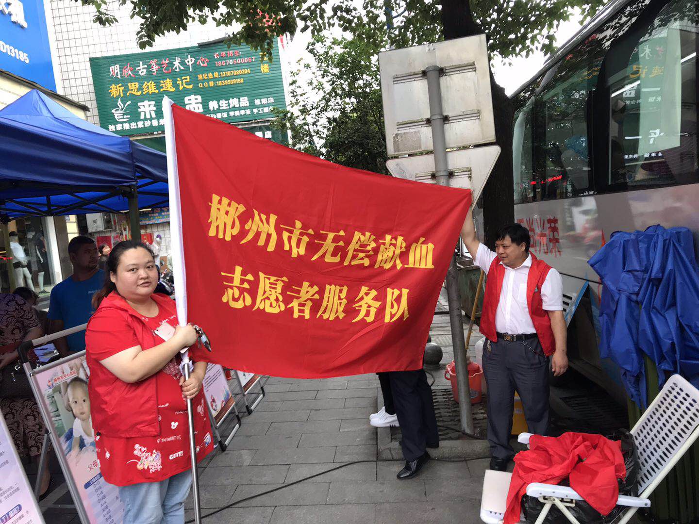 无偿献血志愿者服务队举起队旗,鼓舞更多的人参与无偿献血,并加入郴州市无偿献血志愿者服务队。