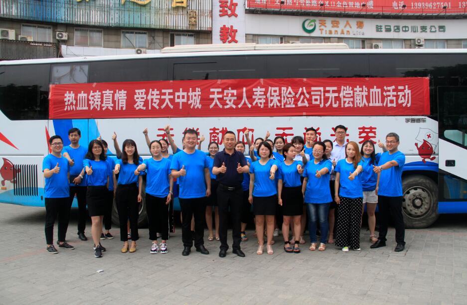 7月2日上午,天安人寿保险驻马店分公司组织全体适龄员工在公司楼下停车场整齐列队,公司总经理发表讲话,现场动员员工踊跃参与无偿献血,近20名自愿捐献热血的志愿者走上献血车,为驻马店市公益事业尽绵薄之力。