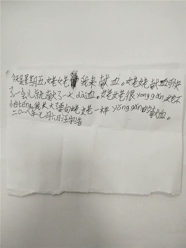 “今天是星期五,姥姥带我来献血。姥姥献血可快了,一会儿就献了一大袋血。姥姥很勇敢,她不怕疼。我长大了要向(像)姥姥一样勇敢的(地)献血。”