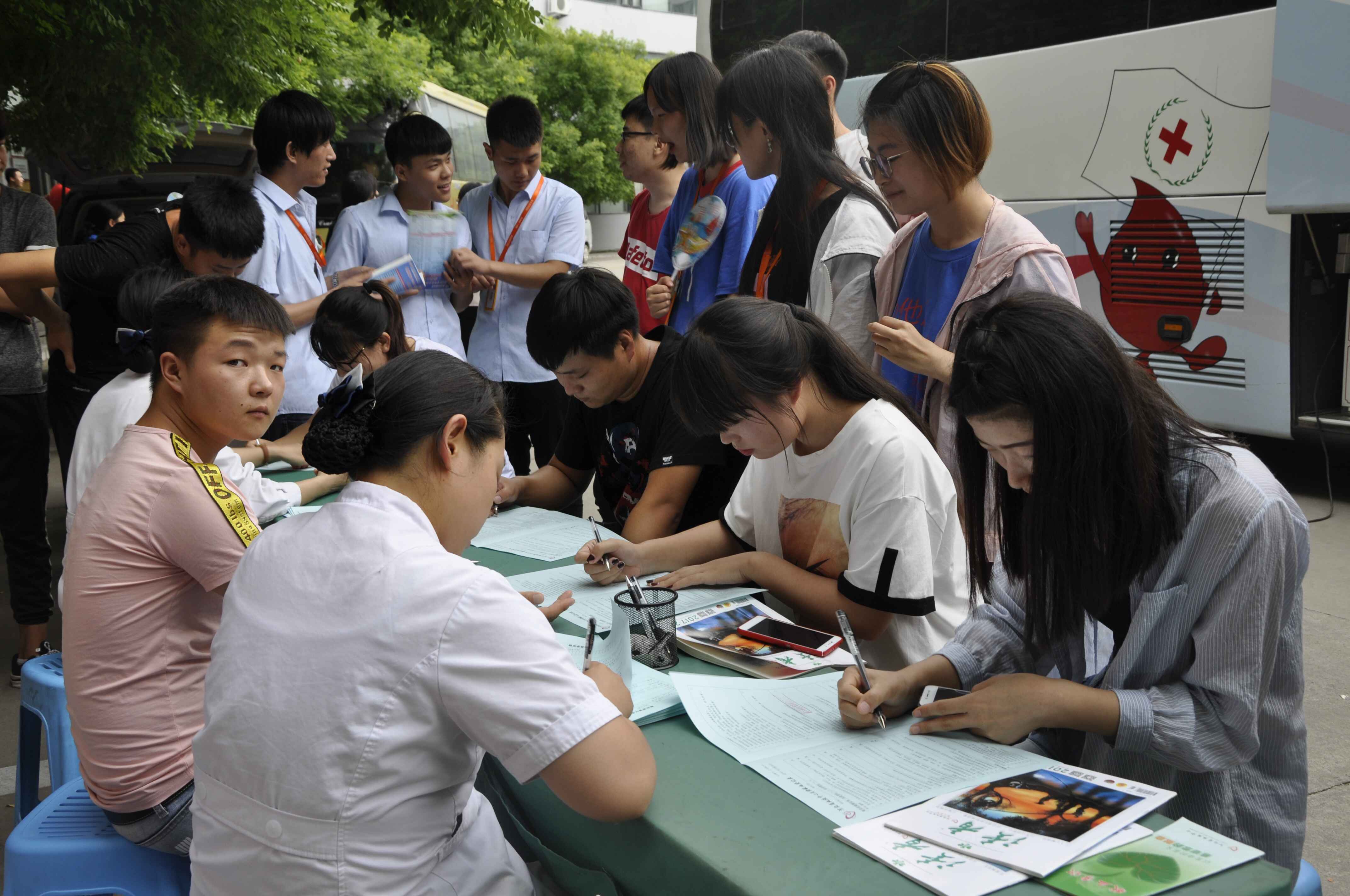 学生们在献血车前填表、化验准备献血。