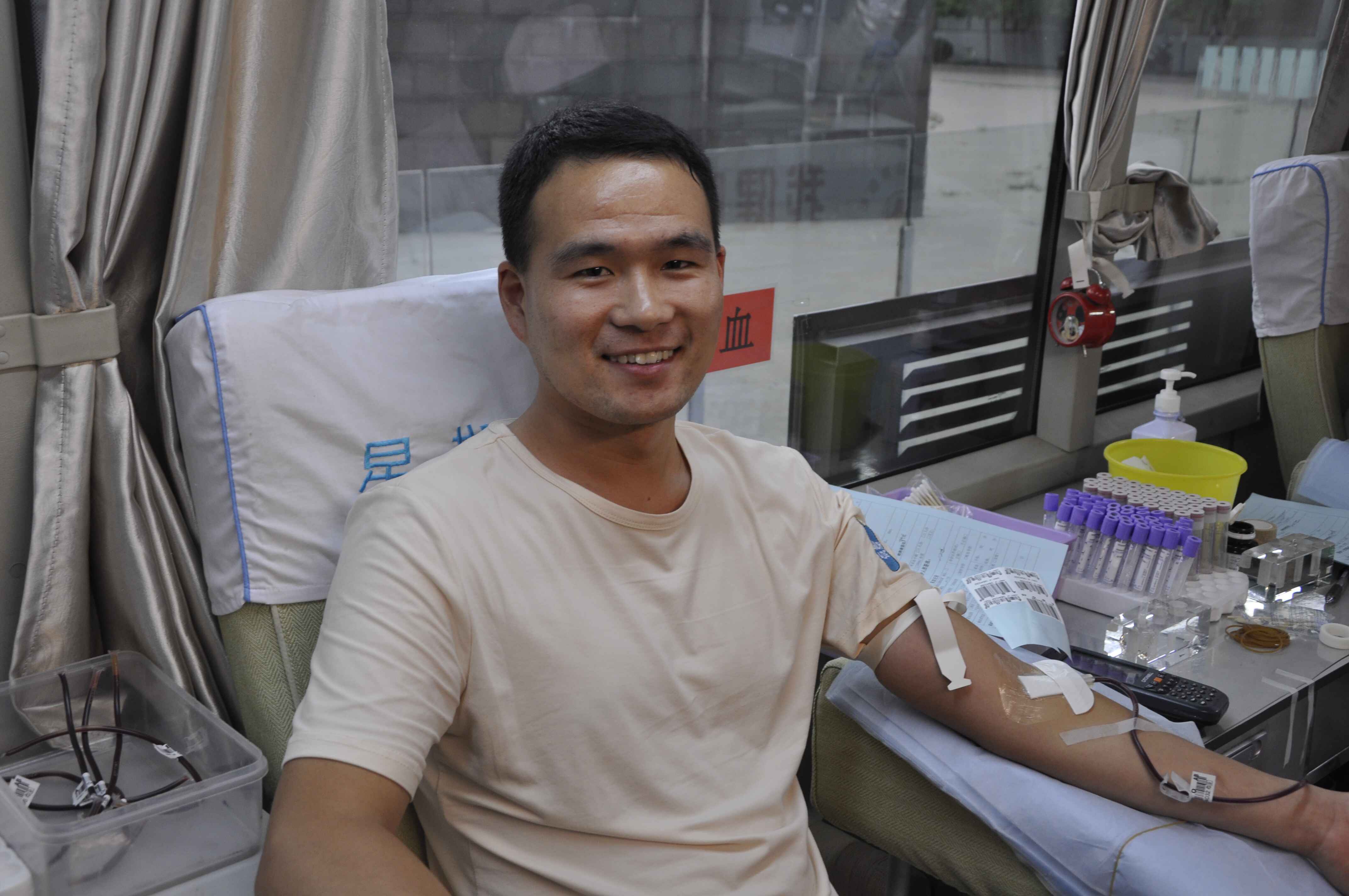 活动当天气温偏高,但献血热情胜高温,学生们在采血工作人员的指导下仍井井有条地进行填表、化验、献血,用自己的实际行动奉献爱心。一股股鲜红的血液顺利流入袋内,想到自己的鲜血能挽救鲜活的生命,每位学生脸上都充满了自豪。一年级的学生谭伟就是其中一位,虽然年纪小但谭伟已经有三次献血经验了,今天是第四次,“无偿献血是每个公民应尽的义务,既是奉献爱心的具体体现,更是对社会公益事业的大力支持,是一件非常有意义的事情,作为青年人,更应该自觉主动参与,做爱心楷模。”