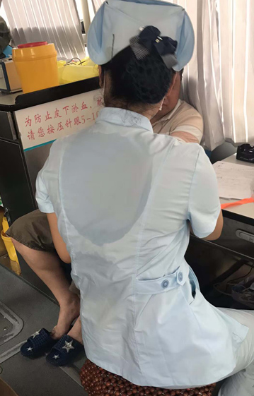 我们的采血车就停放在东姚镇政府门口的大马路上,周围没有一片巴掌大的阴凉,人和车完全暴露在烈日阳光之下。采血车只能靠自带的发电机,维持着空调的运转,为献血群众尽可能提供一个稍微凉快点的献血环境。由于献血群众较多,外界温度很高,车内狭小的环境中给人心燥闷热的感觉。