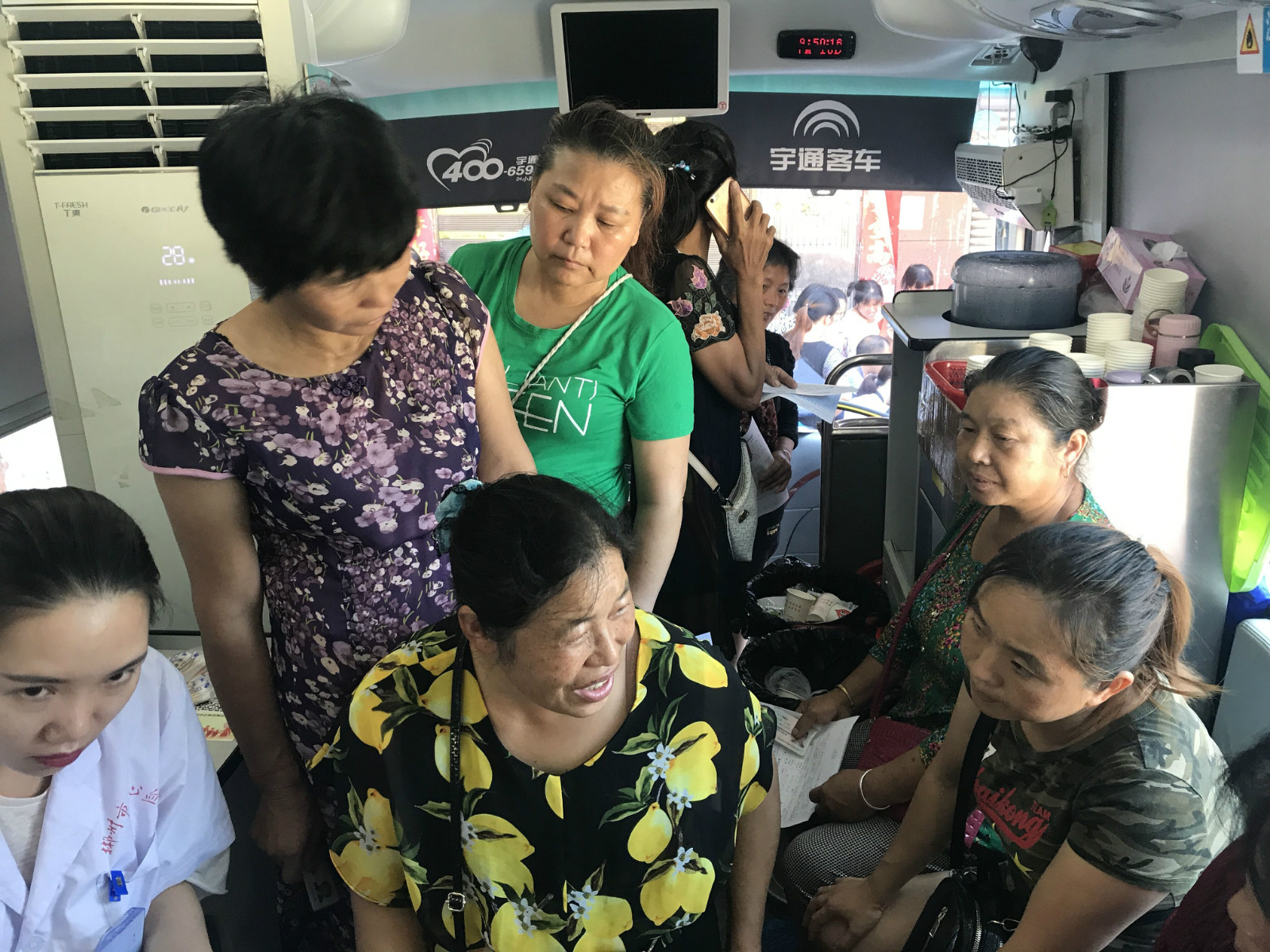 前来献血的村民中,大多数是栗源镇当地的,但也有从其他乡镇特地赶过来的。今年54岁的谭秀芳是邻近一六镇的村民,为了赶来献血,她与同村的白鲜蓉一大早就从家里出发,先步行出村,再坐摩托车到镇里,再坐大巴车到栗源镇,前前后后用了将近一个多小时。谭秀芳说,因为听说栗源镇今天有献血活动,自己上午正好有空,就来献血了,献完血她还要赶回去做农活。