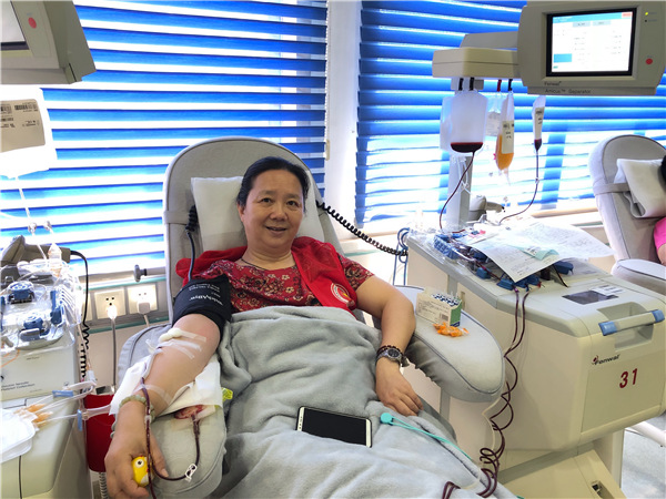 通常大家所了解的“献血”是指捐献全血,其实在捐献全血之外,还有一种捐献成分血,叫做“机采血小板”。相比全血,血小板对某些疾病更具有效性,更能满足一些特殊患者的用血需求。然而捐献血小板对献血者的体质要求更加严格,捐献时间也较长。虽然这对于左姐来说并不陌生,也深知采集的过程和会遇到的问题,但捐献血小板对她来说还是尚未逾越的鸿沟。而就在7月20日,左嫚萍下定决心撸起衣袖,成功捐献血小板2个治疗量。她知道,这是她56岁生日的礼物,也是病患们生命的礼物。