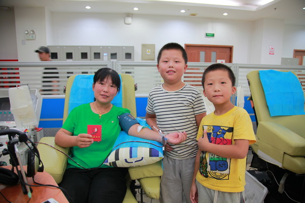 “想回报社会,想帮助别人,咱老百姓也没别的,就捐点血吧!挽救别人,快乐自己!多好!”今天一大 早,7点刚过,王敏就带着两个上小学的儿子来到天津市血液中心登记献血,这已经是她第11次献血了。