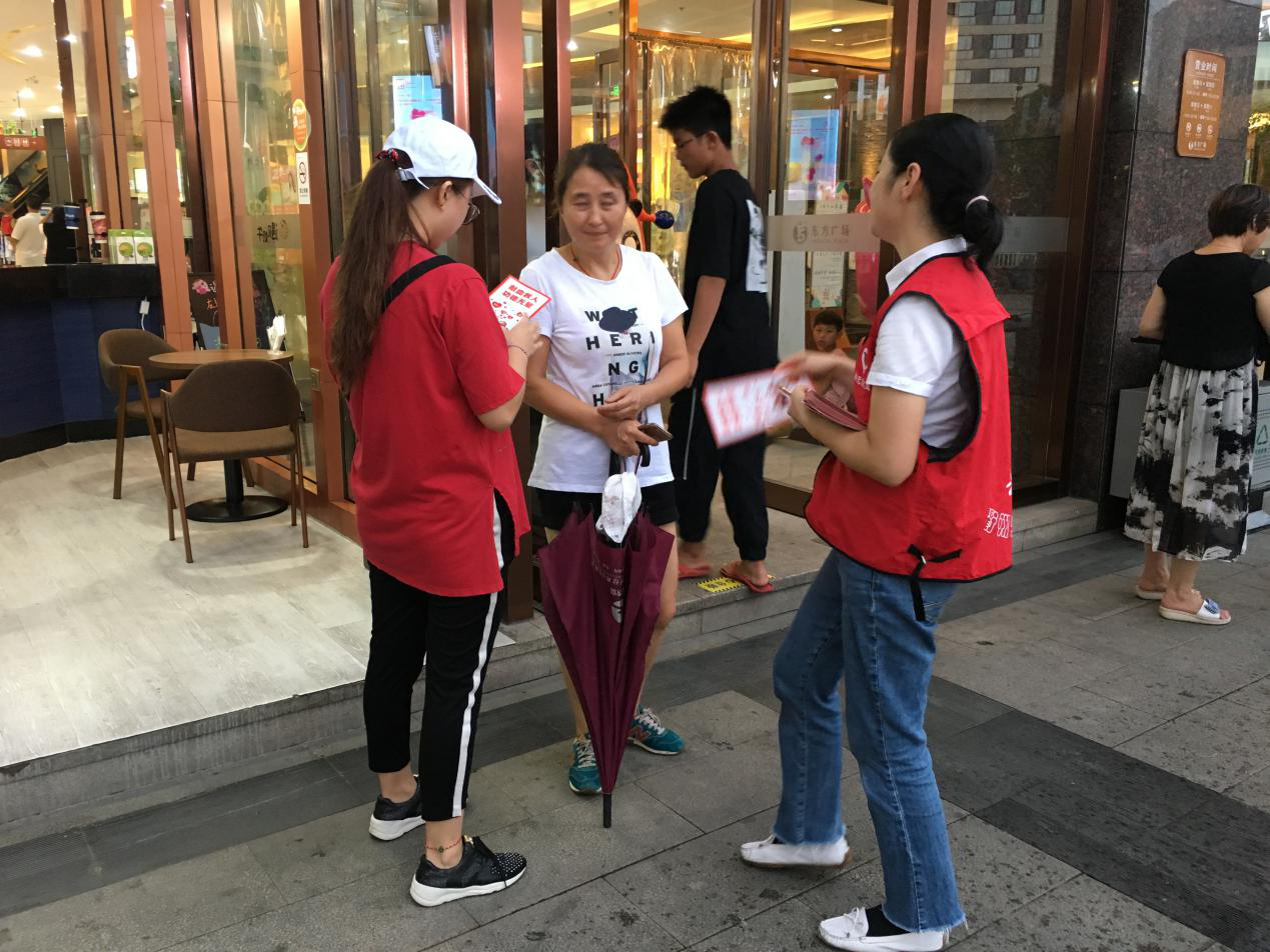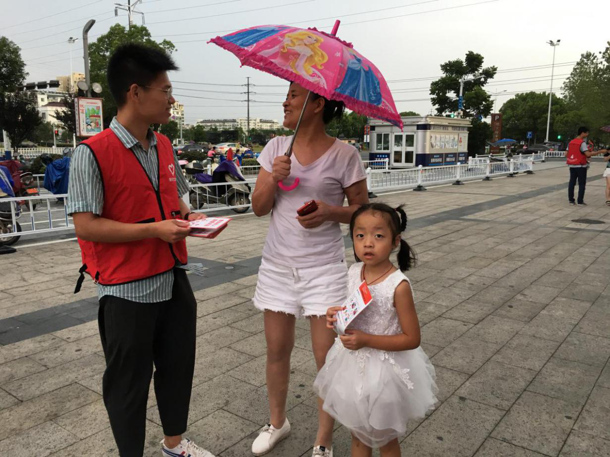 闷热的天气炽烤着大地,志愿者们汗流浃背,却依然挡不住大家志愿服务的热情。你看:统一着红色马甲的志愿者们,他们手拿宣传册,面带微笑,斗志昂扬,点点红色奔走在衢江东方广场的各个角落......
