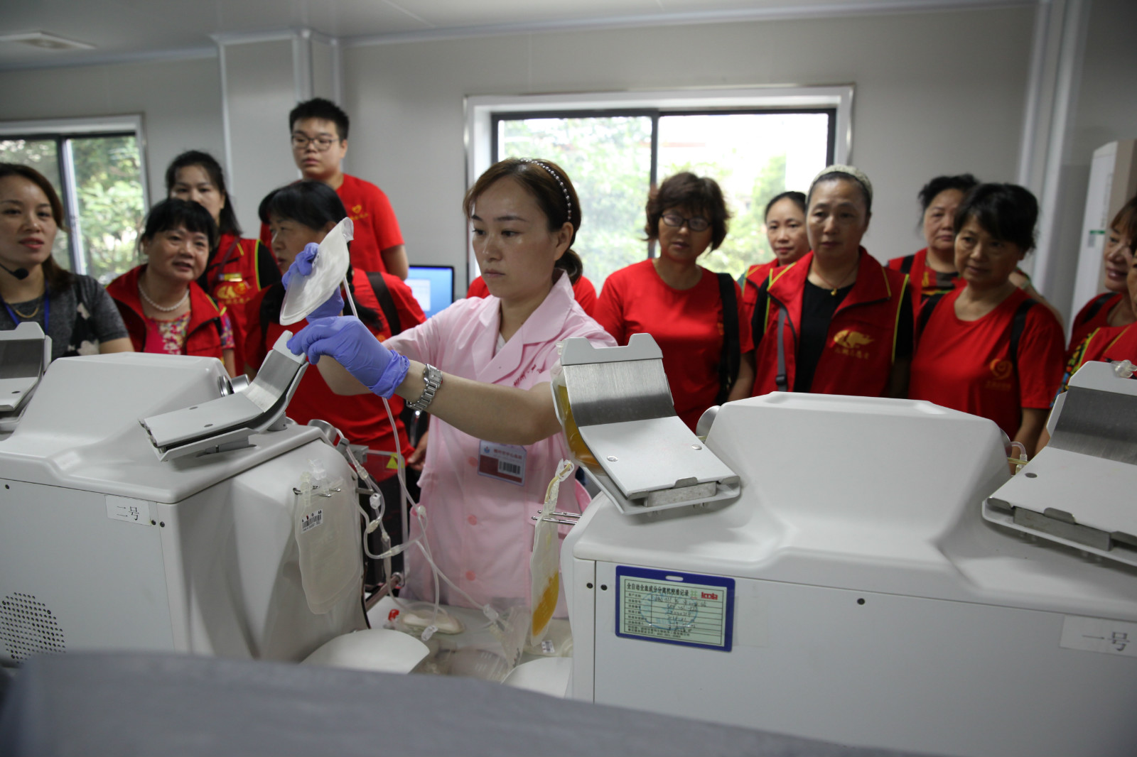 在成分科,大家现场观看了工作人员进行血液滤白、离心、分离等操作,近距离了解了血液中红细胞、白细胞、血小板、血浆等成分的分离制备工作。