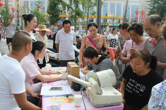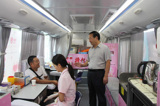 此时,超市门前挤满了前来购物的老年人,不少人看见献血车,便跑来咨询,但他们当中大多数人因为超过献血法定年龄,无法参与献血,只能遗憾离开。随着过往路人越来越多,血站工作人员拿着宣传彩页,不断地鼓励大家加入到献血队伍中来。站长胡章学也专门来到了采血现场,和工作人员一同做起了动员工作,耐心地为路人讲解献血知识,还为等待献血的爱心人士讲述献血前中后的注意事项,叮嘱献血者要多喝水,多注意休息,胡站长亲切的笑容,感染着在场的每一个人。