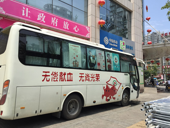 中午的太阳火辣辣的,气温越发的高了,热浪一阵阵的袭来,街上嘈杂的汽车轰鸣声和人声交织在一起,让人更加烦躁,就在这样燥热的三伏天,在41℃的气温下,安康市中心血站的献血车还稳稳地停在路边,等待着爱心人士的到来,等待着这份41℃的爱!