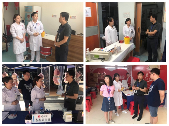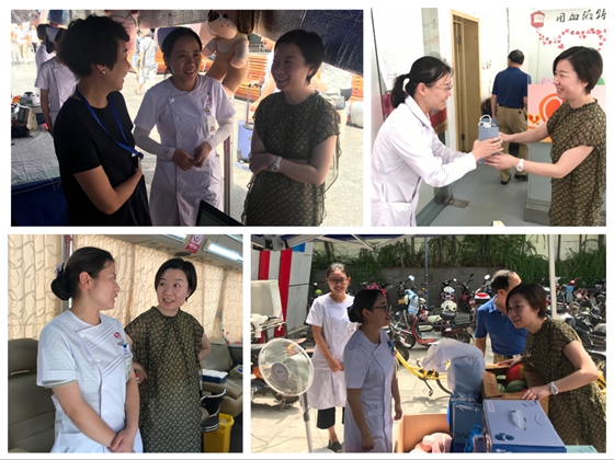 7月25日中午1时,省血管中心主任喻学华及中心领导班子,兵分四路,深入一线,前往全市所有献血点,从中心城区到远城区,从街头采血点到团体献血点,关爱全方位、慰问全覆盖。每到一处,领导们都与工作人员亲切交谈,询问他们工作生活情况,给他们送去防晒降暑的物品,并对一线人员不怕苦、不怕累、斗酷暑、战高温的精神表示充分肯定,嘱咐大家在坚守岗位的同时,要切实做好防暑降温措施,确保一线人员的身体健康。同时,领导们鼓励各献血点再接再厉、克服高温炎热带来的困难,为病患募集更多“救命血”。