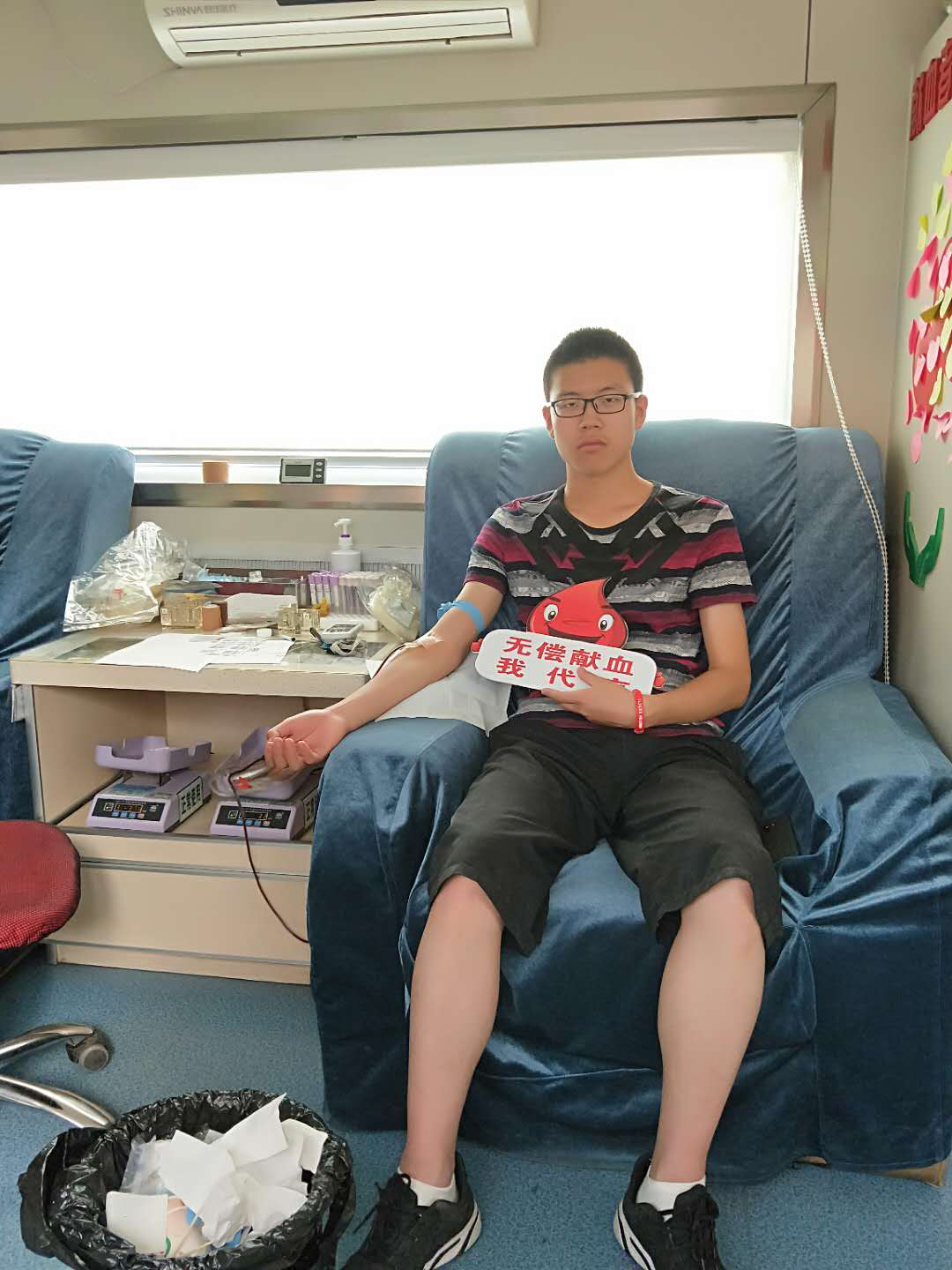 看出他是第一次献血,有些许的紧张,我全程陪他走完献血的全过程。体检合格后,小伙子端正的坐在椅子上,为了缓解他紧张的情绪,分散他的注意力,我问他:“你在哪个学校读书呀?”小伙子腼腆的说:“我是昌吉州二中的高三毕业生,其实我以前经常路过这个爱心献血屋,也知道无偿献血的好处,但是一直苦于没有机会,现在好了,考完了,终于有机会可以献血了,实在是太高兴了!”