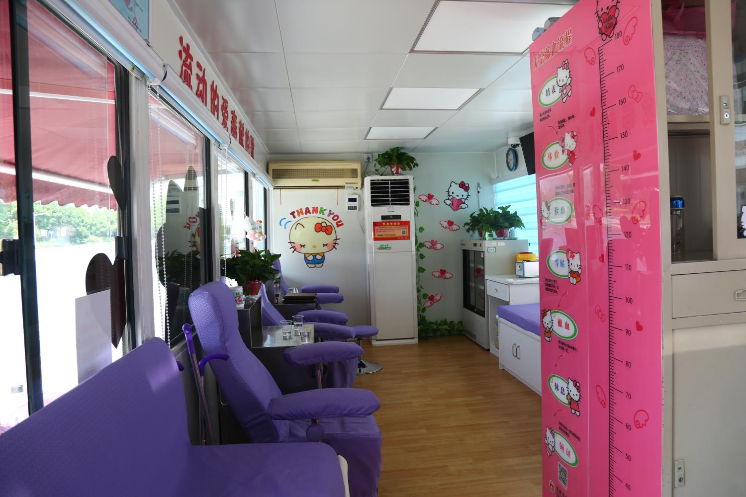 火红靓丽的车身造型,屋内充满了可爱的Kitty主题元素,新增身高测量便民设计,专属的Kitty猫小礼品,吸引众多的年轻人参与无偿献血!